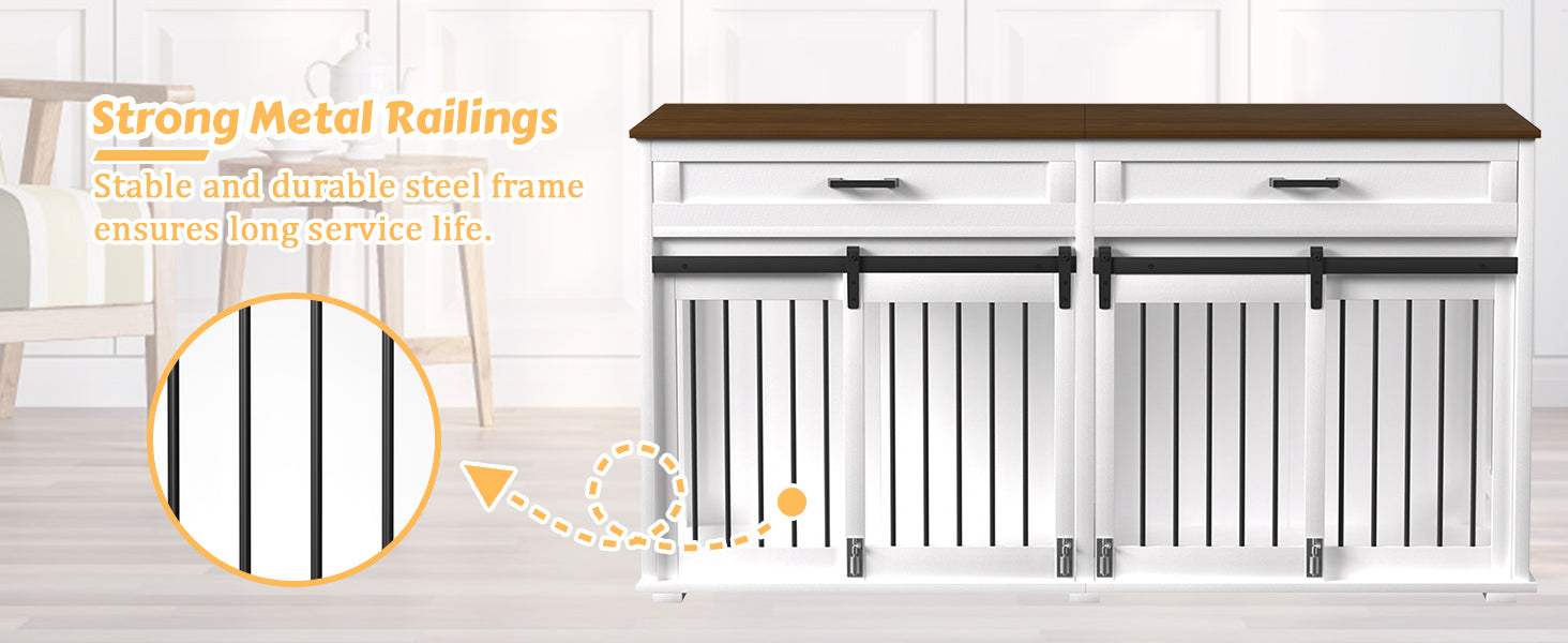 【SAFE AND PRACTICAL】Our indoor dog kennel furniture is supported by a sturdy raised base, ensuring excellent stability. Both drawers are equipped with metal handles for easy pushing and pulling. The metal railings also provide great ventilation for your dogs and make it convenient for you to observe the condition of your pets at any time.