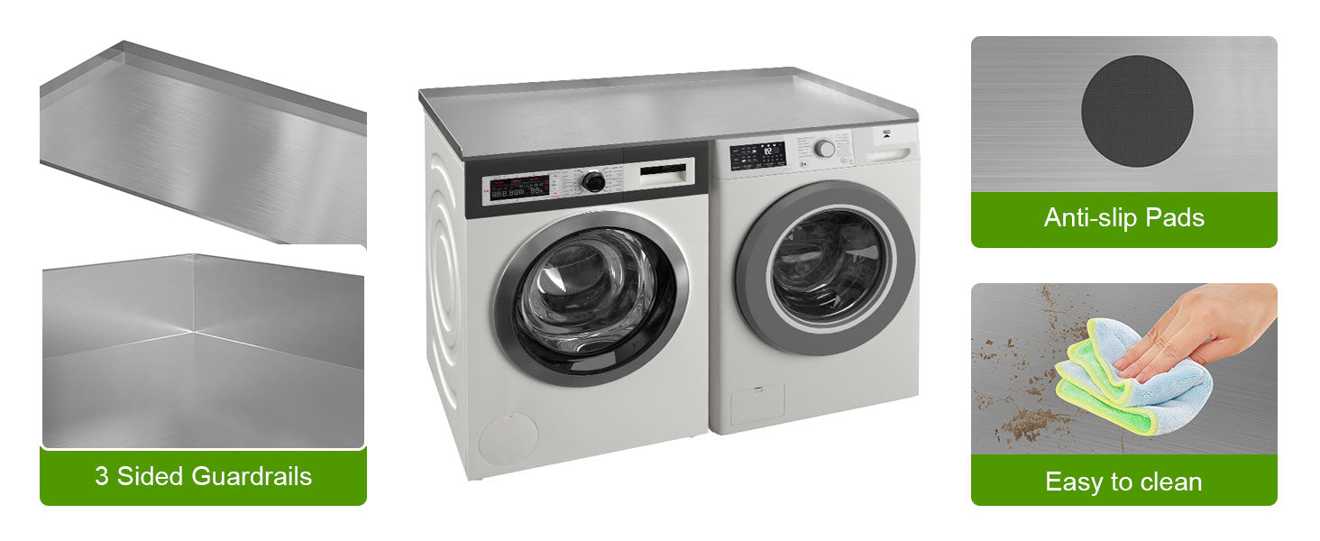 【ANTI-SLIP DESIGN FOR STABILITY】Equipped with non-slip pads, the washer dryer countertop stays securely in place, preventing movement or sliding when the washer or dryer is running. The raised edges on three sides add safety and prevent items from slipping off.