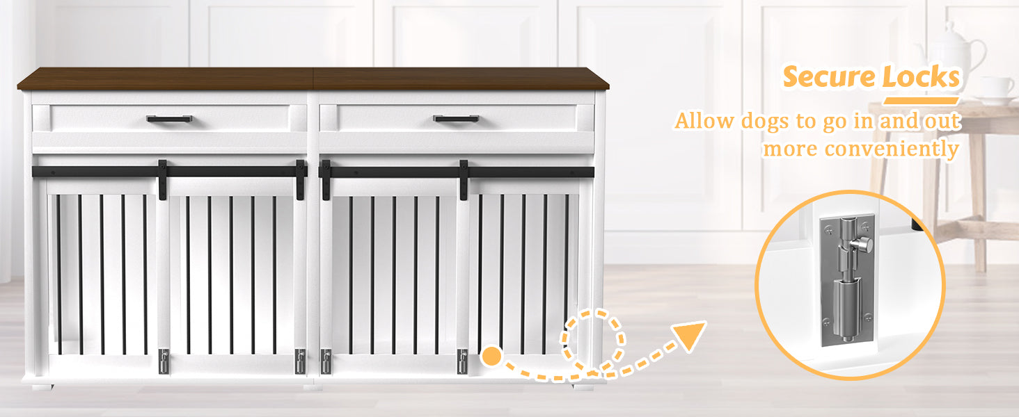 【2-ROOM DESIGN】This dog crate side table has a removable divider in the middle, giving 2 medium to large dogs individual space. Additionally, each of the two rooms is equipped with a metal safety lock, which is sturdy enough to prevent them from running around.