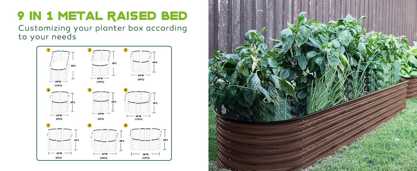 【9-IN-1 MODULAR KITS】The steel garden beds feature 9-in-1 modular kits, providing layout flexibility to fit your garden and backyard. Nine configurations are available to meet your customizable planting ideas.