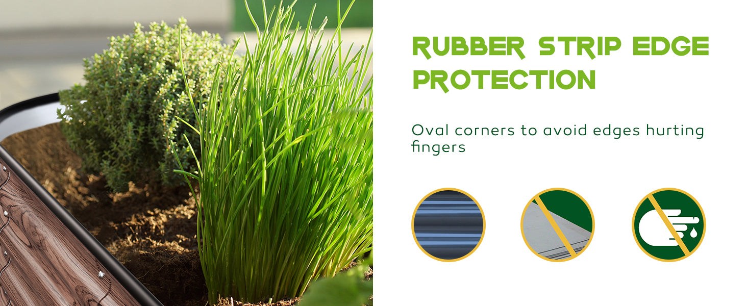 【ERGONOMIC & PROTECTIVE DESIGN】This modular raised garden bed is equipped with a protective rubber strip to ensure you will not get hurt when gardening. With the metal garden bed kits, you can reduce the frequency of bending over when planting, allowing you to reduce back injuries while still experiencing the joy of planting.