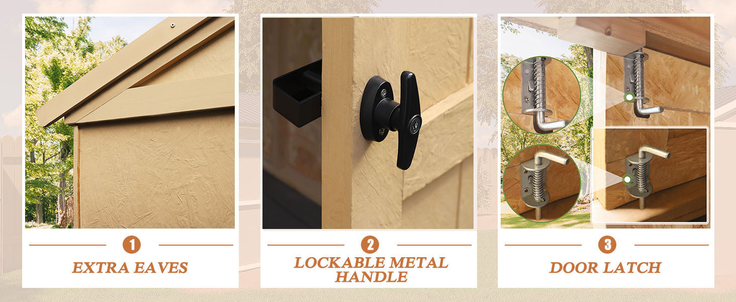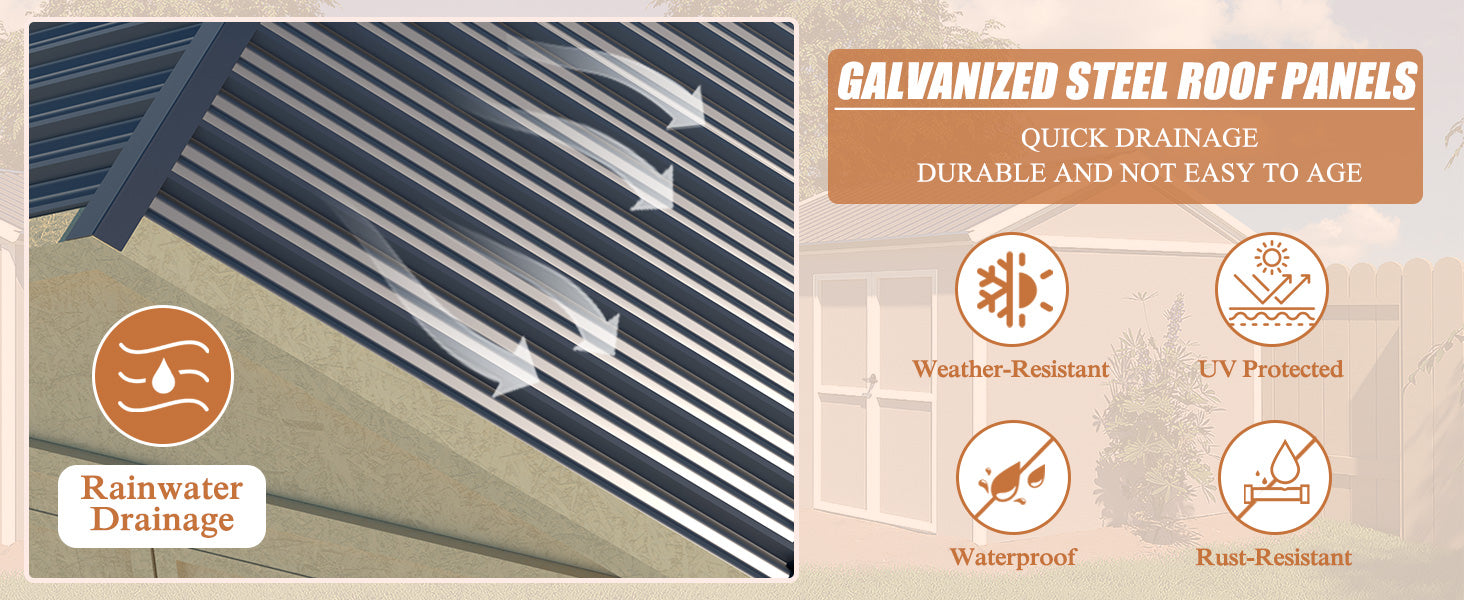 【HIGH-QUALITY MATERIAL】The wooden outdoor storage sheds are expertly crafted with a wooden structure and a durable metal roof. The metal roof is rust-resistant and weather-resistant featuring a drainage system to prevent water gathering. Make sure there are no leaks that could cause items to become wet.