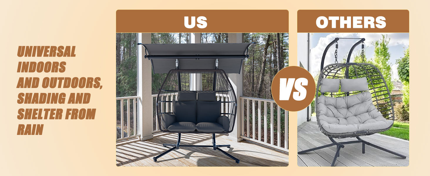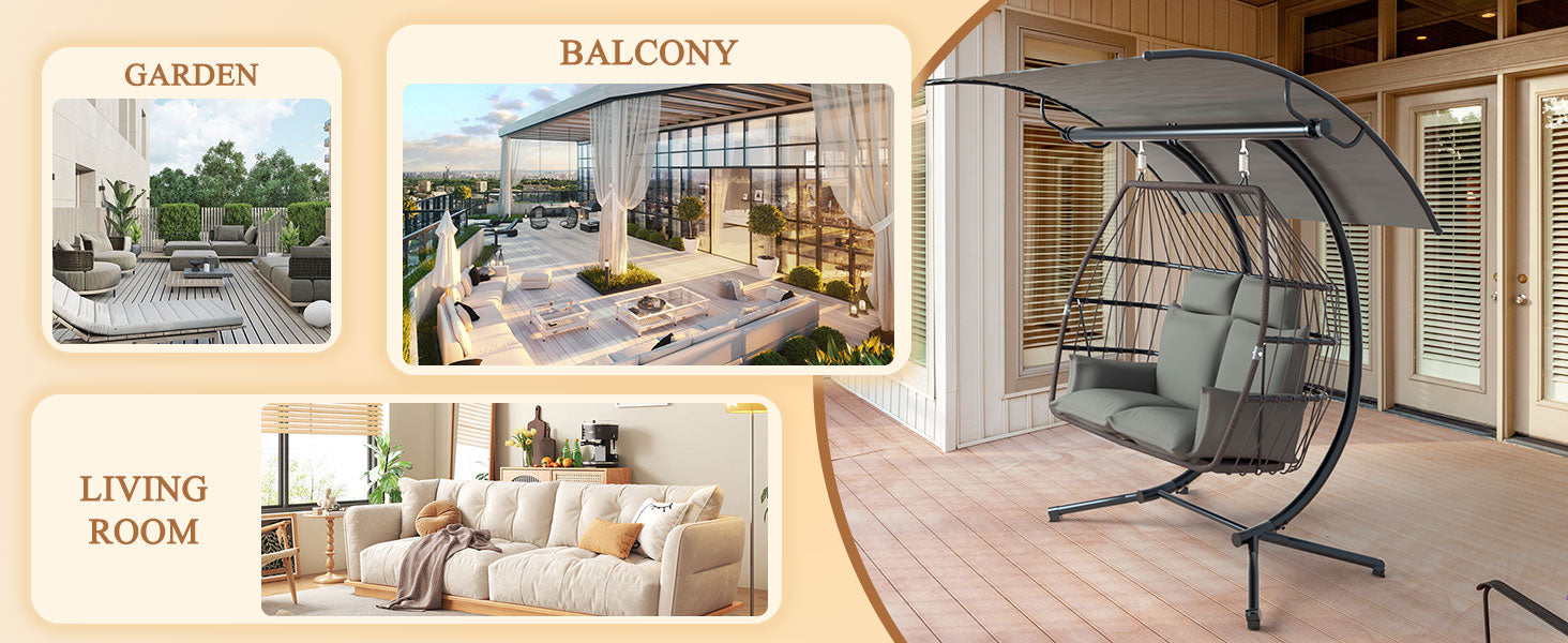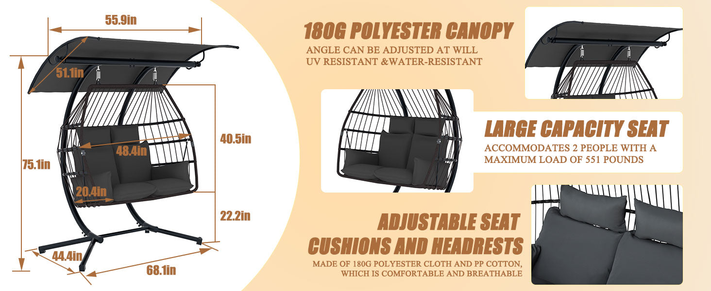 【BEAUTIFUL AND COMFORTABLE】Our patio swing features an egg-shaped design, providing spacious seating for two people, with soft high-resilience cushions and wear-resistant pillows. Exquisite craftsmanship and detail processing bring a very soft and comfortable feeling.