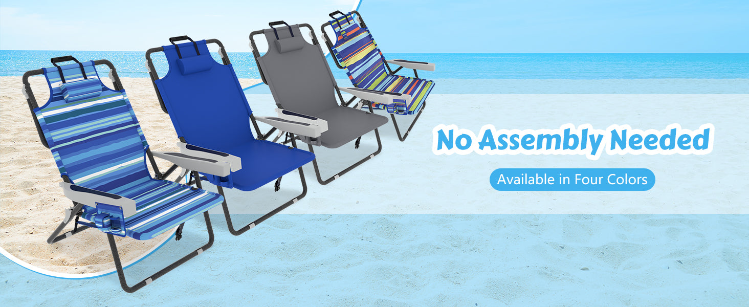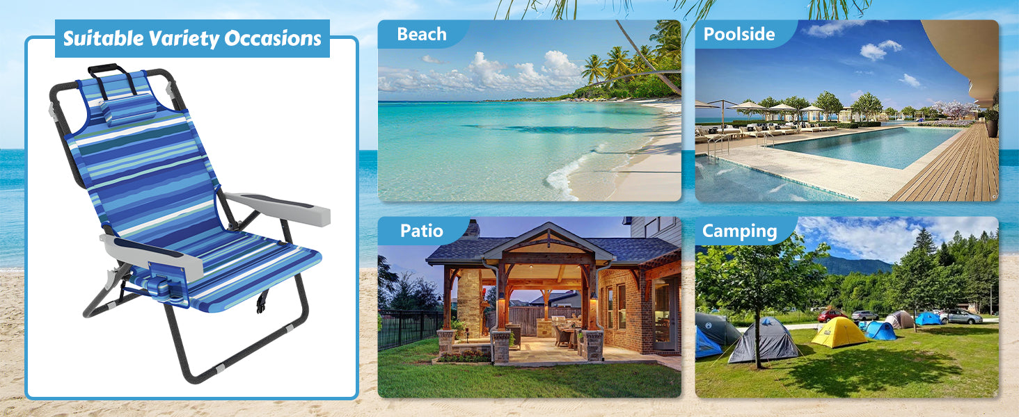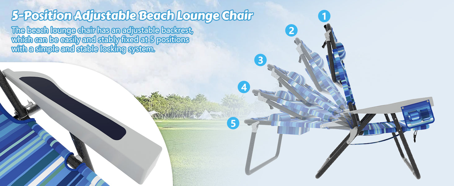 【ADJUSTABLE ANGLES】Designed with 5 adjustable angles, the backpack beach chair effortlessly adapts to your needs—whether you're sitting up to read, reclining to relax, or lying down to sunbathe. Simply adjust the armrests to find your perfect position.