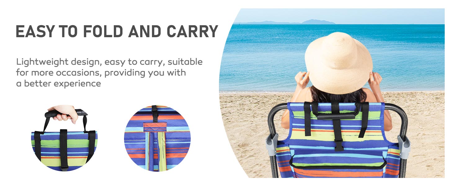 【LIGHTWEIGHT & PORTABLE】With lightweight, the folding beach chair features built-in shoulder straps, allowing you to carry it effortlessly. The quick-folding design makes setup and storage a breeze, perfect for relaxation.