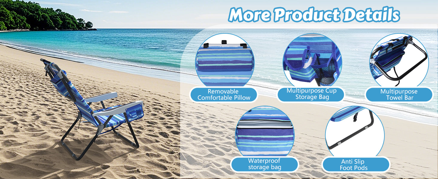 【PRACTICAL & VERSATILE】Equipped with a towel bar, a multifunctional cup holder, and a removable pillow, the backpack beach chairs enhance practicality. A dry storage bag on the back keeps your belongings protected from moisture. Plus, This 5-Position Camping Chair features four anti-slip pads for enhanced stability, making it suitable for various surfaces like beaches and grass.