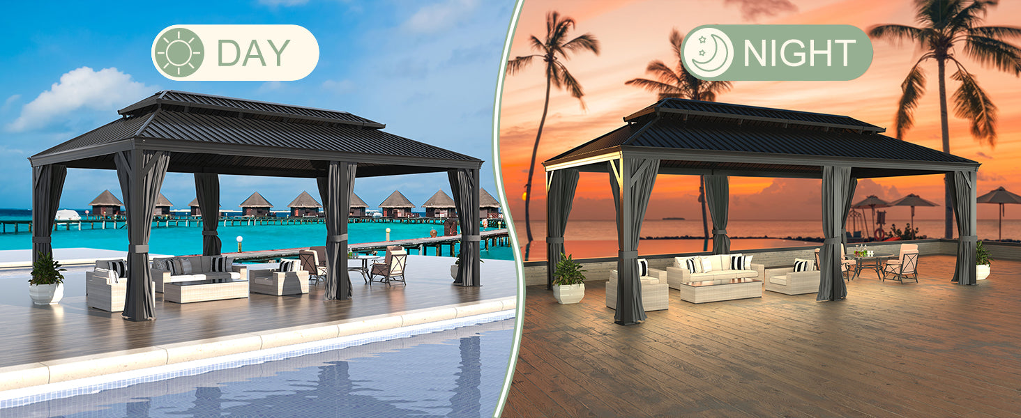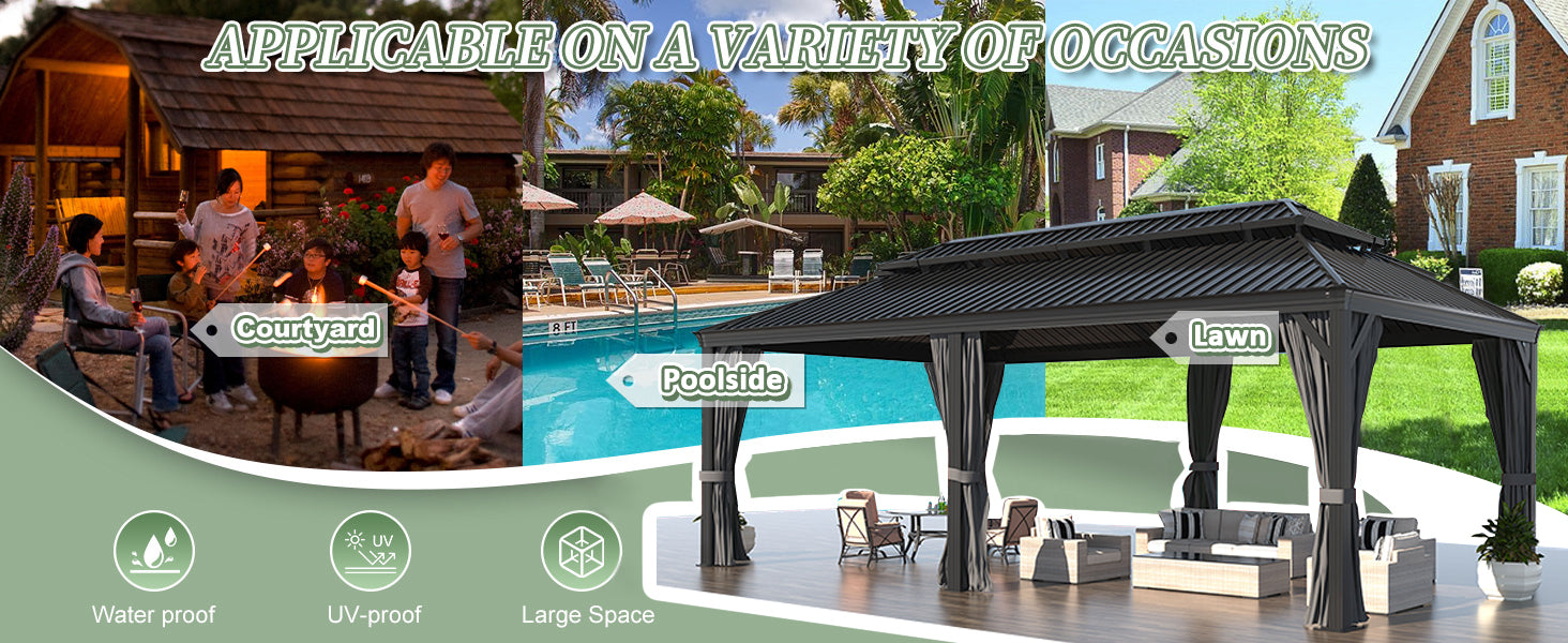 【DOUBLE ROOF WITH HOOKS】This hardtop gazebo has a double roof that is ventilated to ensure its stability in windy weather. It is made of high-quality metal that is powder-coated, UV-resistant, and rust-resistant. There are hooks at the top to hang fans or other decorations for convenience and beauty.