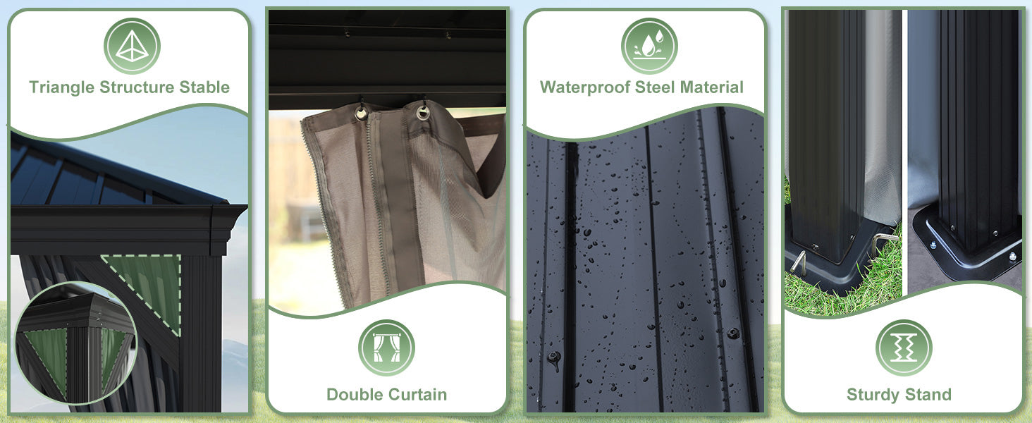 【WATER GUTTER DESIGN】 The water gutter system effectively directs rainwater away from the eaves, channeling it to the ground below. This design alleviates the inconvenience caused by rainfall and melting snow. It enhances its longevity, ensuring that the metal roof gazebo remains in excellent shape for many years to come.