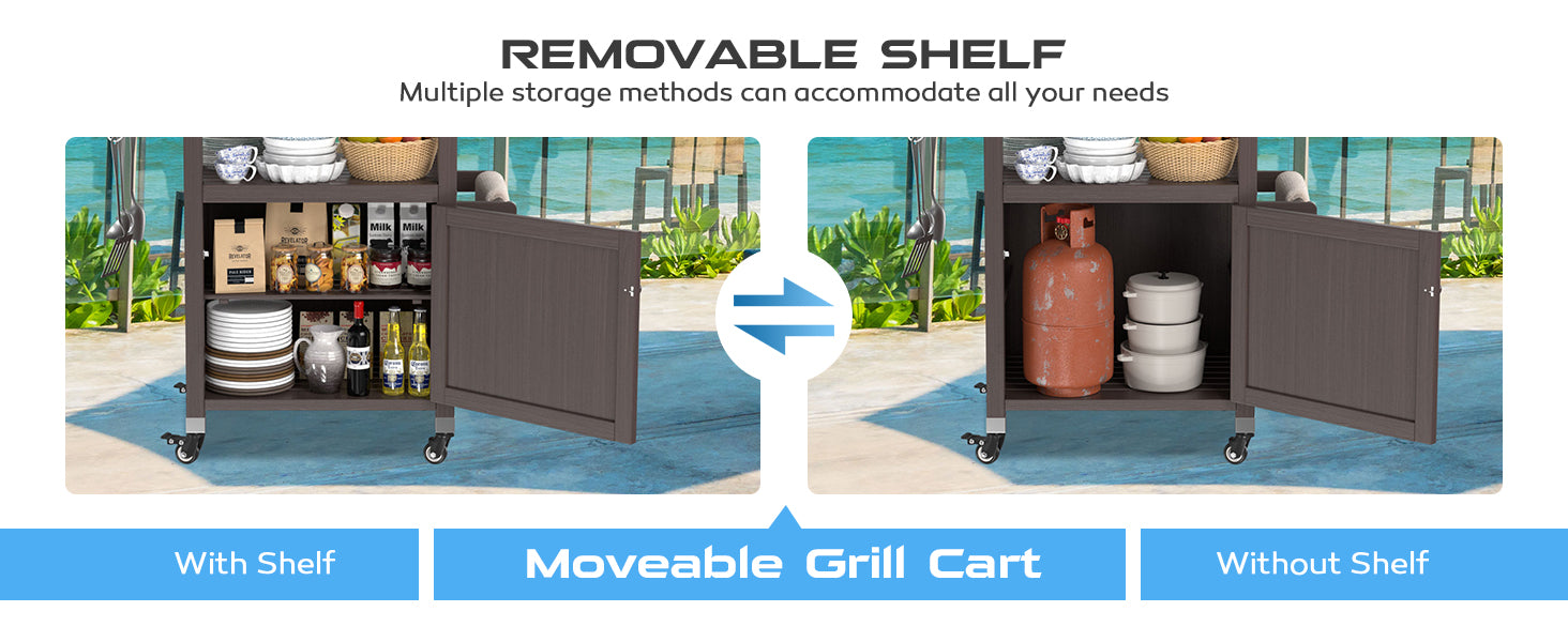 【AMPLE STORAGE SPACE】Our outdoor prep table features a spacious cabinet and an additional storage shelf, providing plenty of room for plates, cups, and other tableware. The removable shelf offers flexible storage options, allowing you to easily accommodate items of varying heights.