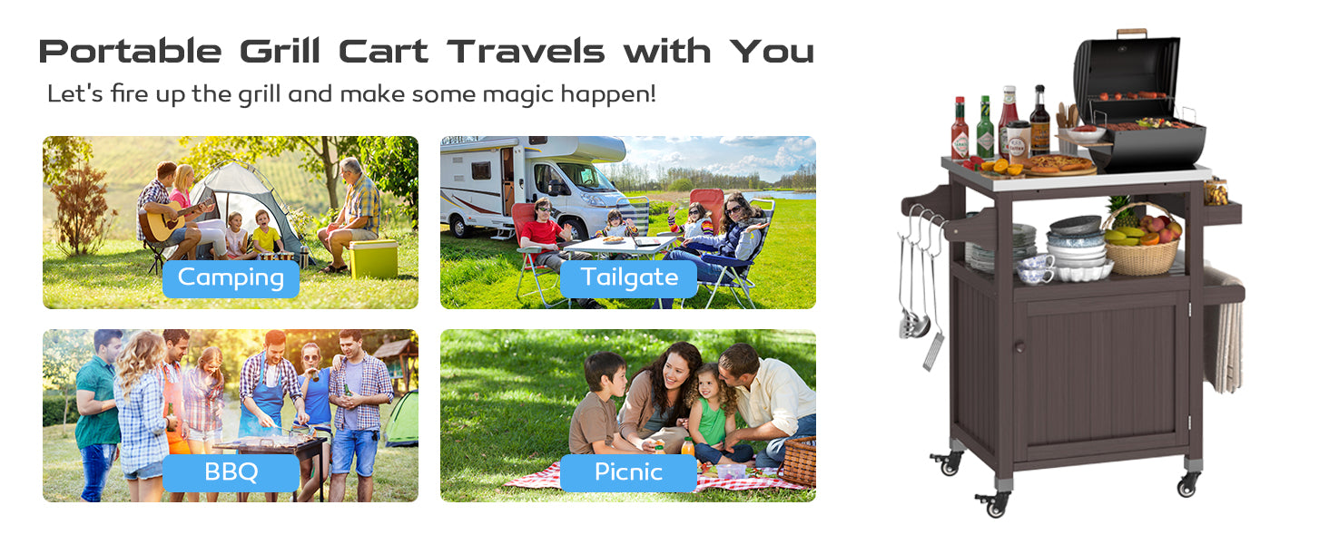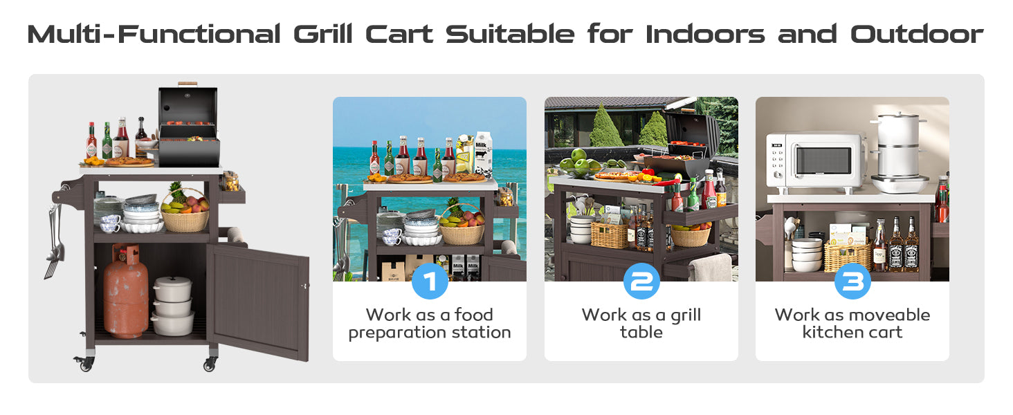 【WIDE USE】Perfectly suited for both indoor and outdoor settings, the barbecue grill carts can serve as a food prep station, grilling table, or outdoor bar cart. Whether you're cooking, serving, or entertaining, it offers exceptional functionality and convenience.