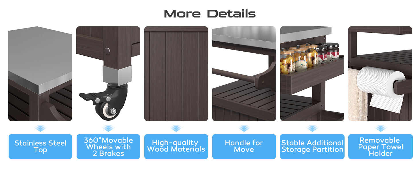 【PREMIUM STAINLESS STEEL TOP】Crafted with a 430 stainless steel tabletop, waterproof and rust-resistant, making the grill cart ideal for outdoor use. The sleek surface is easy to clean—simply wipe it down with a damp cloth for hassle-free maintenance.